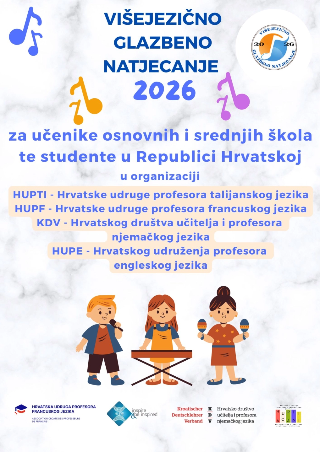 S ciljem promicanja višejezičnosti, hrvatske udruge profesora stranih jezika (HUPTI – Hrvatska udruga profesora talijanskog jezika, KDV – Hrvatsko društvo učitelja i profesora njemačkog jezika, HUPF – Hrvatska udruga profesora francuskog jezika i HUPE – Hrvatsko udruženje profesora engleskog jezika), uz potporu svojih partnerskih institucija, pozivaju učenike osnovnih i srednjih škola te studente iz cijele Hrvatske na izradu glazbenih videouradaka na talijanskom, francuskom, njemačkom, španjolskom i engleskom jeziku.